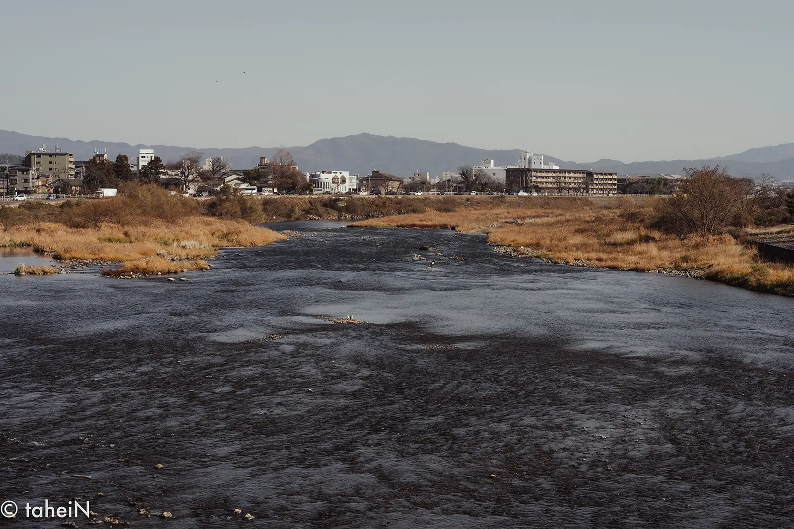 嵯峨野と嵐山を隔てて流れる桂川に架かるその橋は、川下を見渡せば穏やかな街並みが。川上には、先ほどまでいた嵐山が見えます。